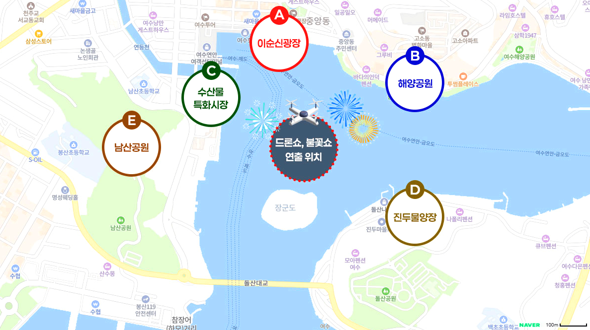 축제가 열리는 해상과 가까운 시내 중심가부터 파노라마 뷰를 제공하는 고지대까지, 여수시는 관람객 안전과 시야 확보를 위해 5개 구역을 공식 관람존으로 지정했습니다. 각 구역의 특징을 파악하고 최적의 명당을 선점하세요.
