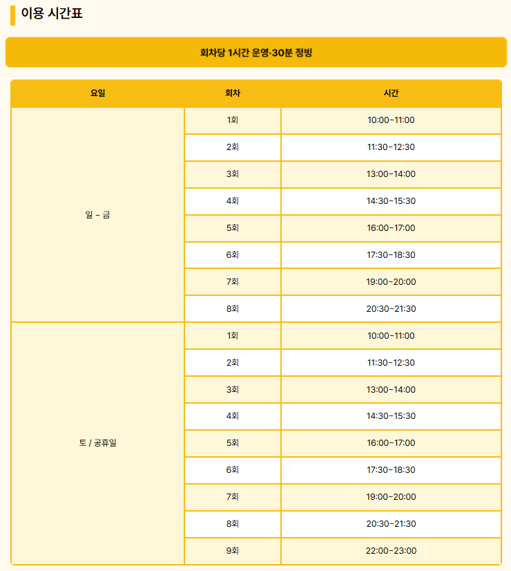 • 주말 및 공휴일 (토/공휴일): 10:00부터 23:00까지 총 9회차로 연장 운영됩니다.